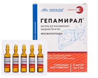 Состав: «Гепамирал» содержит в 1 мл в качестве действующего вещества фосфатидилхолина – 50 мг, а также вспомогательные вещества: дезоксихолевая кислота, бензиловый спирт, натрия хлорид, натрия гидроксид, рибофлавин натрия фосфат и воду для инъекций.