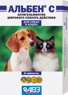 ПРЕИМУЩЕСТВА:Широкий спектр антигельминтного действия. Действует на все стадии развития круглых и ленточных гельминтов. Подходит для лечения лямблиоза и гельминтозов, осложненных лямблиозом.Имеет вкус и аромат свежего мяса. Разрешено применять щенкам с 3-недельного возраста, котятам 3-месячного возраста. СОСТАВ: АЛЬБЕН С в качестве действующих веществ в 1 таблетке содержит альбендазол – 250 мг и празиквантел – 25 мг, а также вспомогательные вещества: лактозу, крахмал картофельный, вкусовую добавку с ароматом свежего мяса. ПОРЯДОК ПРИМЕНЕНИЯ: АЛЬБЕН® С применяют собакам и кошкам индивидуально, однократно, перорально (внутрь) в утреннее кормление с небольшим количеством корма в дозе 1 таблетка на 5 кг, что соответствует 50 мг/кг альбендазола и 5 мг/кг празиквантела. Собакам и кошкам массой менее 2,5 кг 1 таблетку препарата измельчают, суспендируют в 10 мл питьевой воды, интенсивно взбалтывают и вводят животному с помощью шприца без иглы, из расчета 1 мл суспензии на 0,5 кг массы животного.