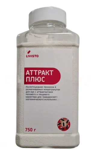 Аттракт Плюс - это инсектицидная приманка в виде размачиваемых микрогранул для борьбы с мухами с продолжительностью действия до 3 месяцев.