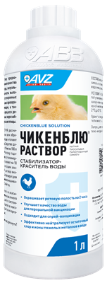 ЧИКЕНБЛЮ® раствор применяют для улучшения качества водопроводной воды, контроля полноты выпаивания птице растворенных в воде иммунобиологических или иных лекарственных препаратов, при спрей-вакцинации, а также для контроля процесса дезинфекции системы водоснабжения цеха содержания птицы.