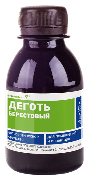 Деготь берестовый - натуральное антисептическое средство, предназначенное для обработки животноводческих помещений, оборудования и инвентаря.Деготь берестовый за счёт входящих в состав активных веществ оказывает следующие действия:антисептическое, дезинфицирующее, инсектицидное и противопаразитарное; противовоспалительное, противозудное, обезжиривающее, дренажное, снижение экссудации;