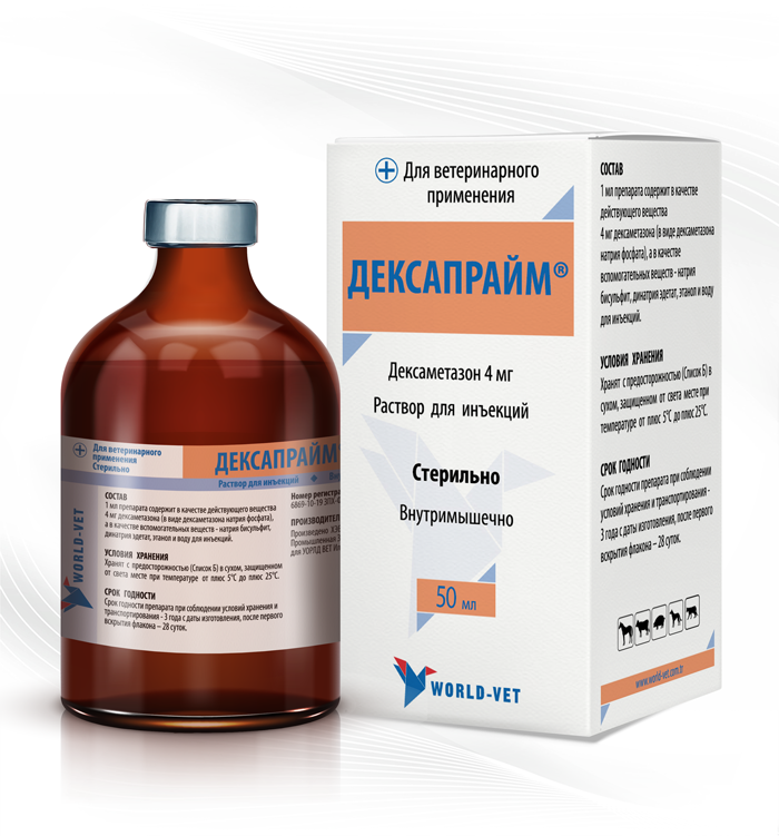 Дексапрайм вводят внутримышечно, желательно в первой половине дня: лошадям и крупному рогатому скоту - 5 мл; свиньям - 2-3 мл; поросятам, собакам - 0,5-1 мл; кошкам-0,25- 0,5 мл один раз в день в течение трех суток.
