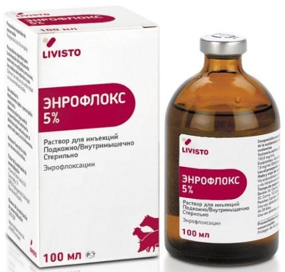 СОСТАВ: в 1 мл содержит в качестве действующего вещества энрофлоксацин — 50 мг и вспомогательные вещества. Относится к антибактериальным лекарственным препаратам группы фторхинолонов. Действует бактерицидно на грамотрицательные микроорганизмы в период покоя и деления, на грамположительные микроорганизмы — в период деления. ПРИМЕНЕНИЕ. Энрофлокс 5% назначают для лечения бронхопневмонии, энзоотической пневмонии, колибактериоза, сальмонеллеза и других болезней бактериальной этиологии, вызванных микроорганизмами, чувствительными к фторхиполонам у крупного и мелкого рогатого скота и свиней.