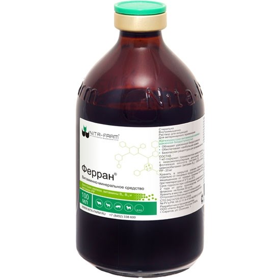 Двукратное увеличение усвоения железа в организме животного за счет сочетания в препарате железа и специально подобранного комплекса витаминов группы В. СОСТАВ: В качестве действующих веществ 1 мл раствора содержит 100 мг трехвалентного железа (в комплексе с низкомолекулярным декстраном). Применяют молодняку крупного и мелкого рогатого скота, свиньям, жеребятам, пушным зверям и собакам с лечебной и профилактической целью при анемиях (постгеморрагической, гемолитической, гипопластичской и апластической, алиментарной).