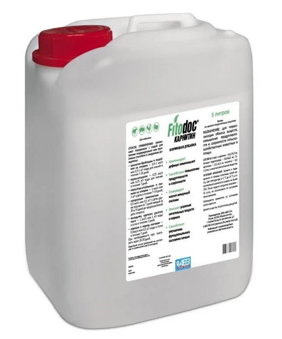 Преимущества: Компенсирует дефицит аминокислот. Способствует повышению продуктивности и сохранности. Стимулирует клетки иммунной системы. Улучшает усвоение питательных веществ и кормов. Способствует улучшению функционального состояния печени. СОСТАВ: в 1 мл в содержит: L-карнитин - 45,0-55,0 мг, бетаина гидрохлорид - 54,0-66,0 мг, DL-метионин - 13,5-16,5 мг, инозитол - 9,0-11,0 мг, а также вспомогательные вещества: глицерин – 340-420 мг, нипазол – 4,5-5,5 мг. ПОКАЗАНИЯ К ПРИМЕНЕНИЮ. Кормовая добавка для нормализации обмена веществ, повышения продуктивности и сохранности сельскохозяйственных животных и птицы, а также для улучшения функционального состояния печени, нормализации обменных процессов и повышения стрессоустойчивости собак и кошек. Применяют сельскохозяйственным животным и птице перорально (внутрь) с водой для поения индивидуально или групповым способом, собакам и кошкам применяют с водой для поения или в смеси с кормом.