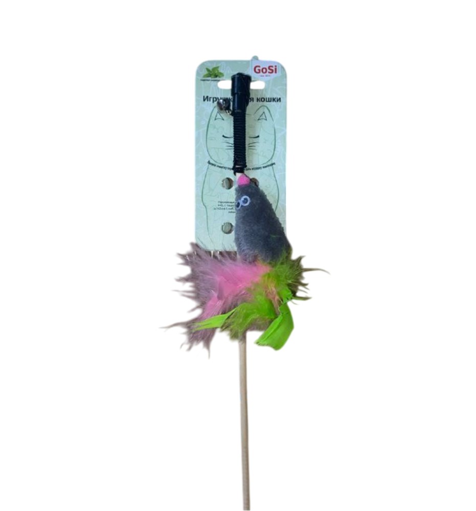 Игрушка Махалка-Удочка "Мышь с кошачьей мятой, хвост-перо пышное" Серая GoSi