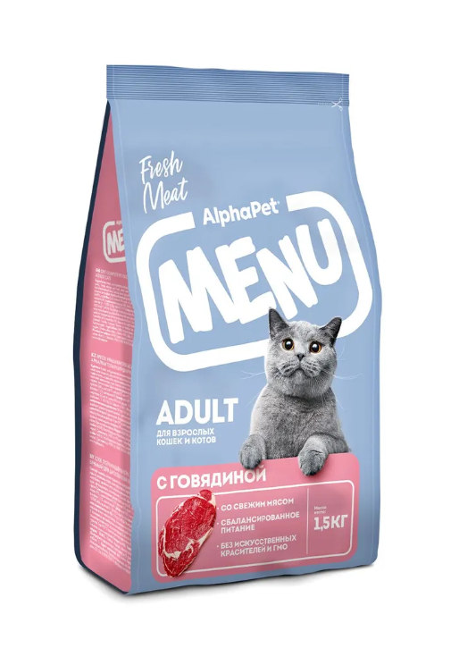 Корм AlphaPet Menu для взросл. кошек и котов с говядиной 1,5кг (2765)