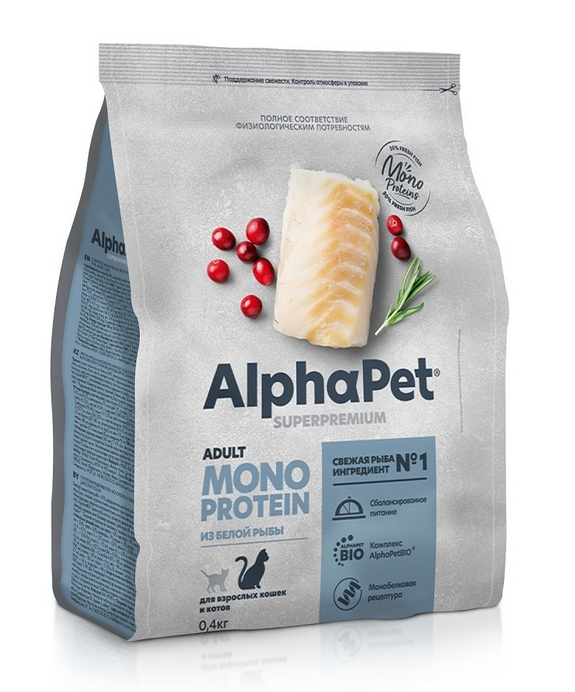 Корм AlphaPet Superpremium MONOPROTEIN сухой полнор-й для взр.кошек из белой рыбы 0,4кг (2833)