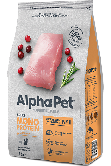 Корм AlphaPet Superpremium MONOPROTEIN сухой полнор-й для взр.кошек из индейки 1,5кг (2628)