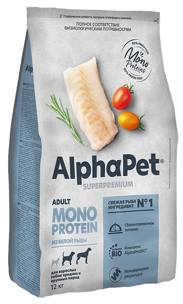 Корм AlphaPet Superpremium MONOPROTEIN сухой полнор-й для взр.соб.ср.и кр.пор.из БЕЛОЙ РЫБЫ12кг(2901