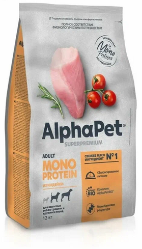 Корм AlphaPet Superpremium MONOPROTEIN сухой полнор-й для взр.соб.ср.и кр.пор.из индейки 12кг (2680)