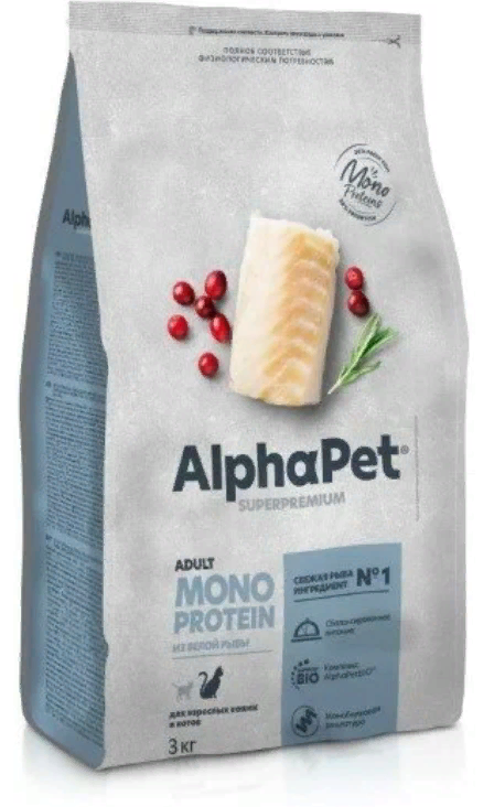 Корм AlphaPet Superpremium MONOPROTEIN сухой полнор-й для взр.собак мелк.пор.из белой рыбы 3кг(2888)