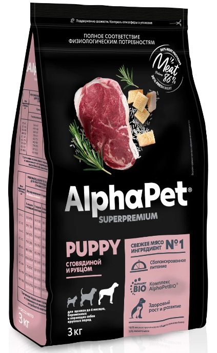 Корм AlphaPet Superpremium сухой полн-й д/круп щенков до 6м,берем собак с говяд. и рубц.3кг(1478)