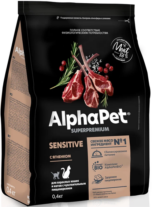 Корм AlphaPet Superpremium сухой полнор-й для кошек и котов с чувствит. пищев-м ягненок 0,4кг(1010)