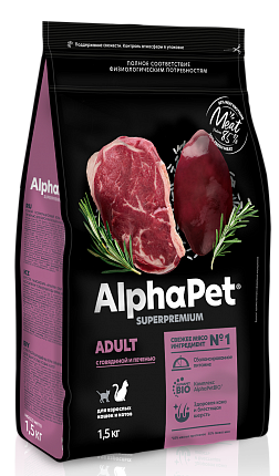 Корм AlphaPet Superpremium сухой полнор-й для кошек и котов с говядиной и печенью 1,5кг(0839)