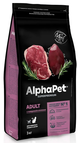 Корм AlphaPet Superpremium сухой полнор-й для кошек и котов с говядиной и печенью 3кг(0860)
