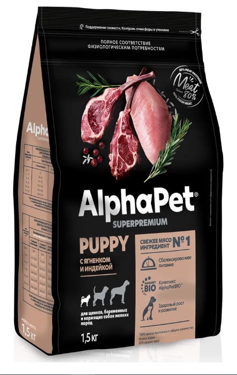 Корм AlphaPet Superpremium сухой полнор-й для щенков,берем и корм/собак с ягненк. и индейк1,5кг(1157