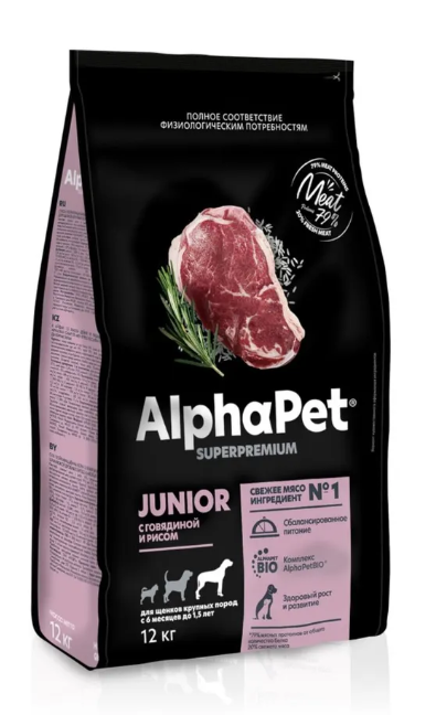 Корм AlphaPet Superpremium сухой полнор-й для щенков круп/пор (с 6мес-до1,5л) говядина/рис18кг(1768)