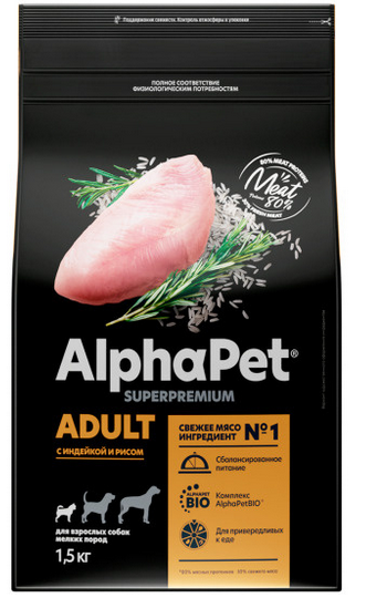 Корм AlphaPet Superpremium сухой полнор-й для собак мелких пород с чувст пищ ягненок/рис 1,5кг(1188)