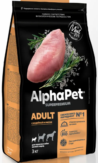 Корм AlphaPet Superpremium сухой полнор-й для собак мелких пород с индейкой и рисом 7кг (2291)