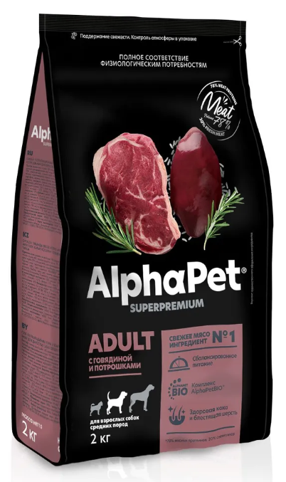 Корм AlphaPet Superpremium сухой полнор-й для собак средних пород с говядиной и потрошками 2кг(1393)