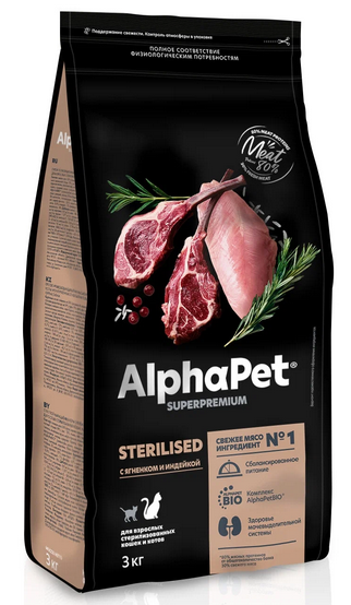 Корм AlphaPet Superpremium сухой полнор-й для стерил. кошек и котов с ягненком и индейкой 3кг(1676)