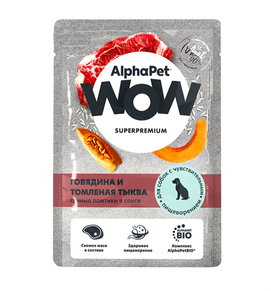 Корм AlphaPet WOW Superpremium пауч для собак с чувст.пищ-м"Говядина и томл.тыква в соусе"85г(5339)