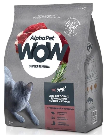 Корм AlphaPet WOW Superpremium сухой полнор-й для кошек и котов с говядиной и печенью 7кг(2055)
