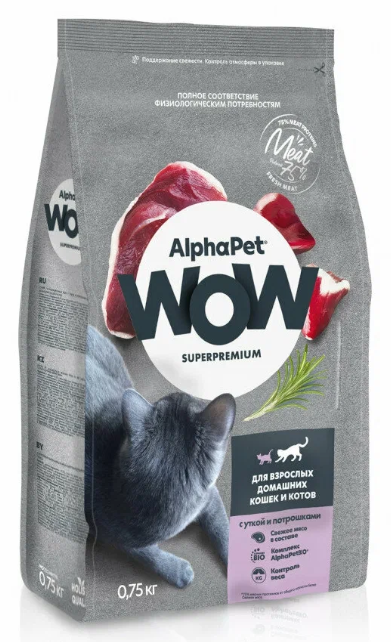 Корм AlphaPet WOW Superpremium сухой полнор-й для кошек и котов с уткой и потрошками 0,75кг (0884)