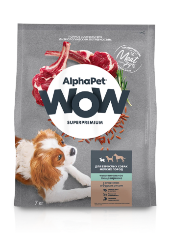 Корм AlphaPet WOW Superpremium сухой полнор-й для собак мелк/пор с чув пищ ягненок/бур. рис 7кг(2239
