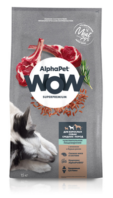 Корм AlphaPet WOW Superpremium сухой полнор-й для собак средн пород с говядиной и сердцем 15кг(2246)