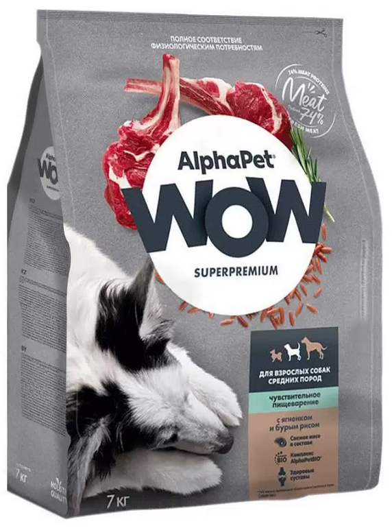 Корм AlphaPet WOW Superpremium сухой полнор-й для собак средних пород с говядиной и сердцем 7кг(1874