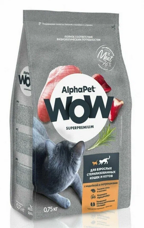 Корм AlphaPet WOW Superpremium сухой полнор-й для стерил/кошек и котов с индейк и потрош 0,75кг(0761