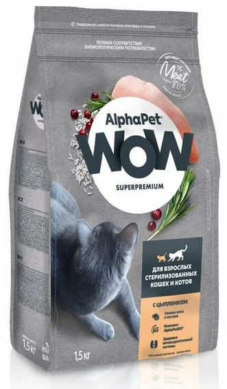 Корм AlphaPet WOW Superpremium сухой полнор-й для стерил. кошек и котов с цыпленком 1,5кг(0877)