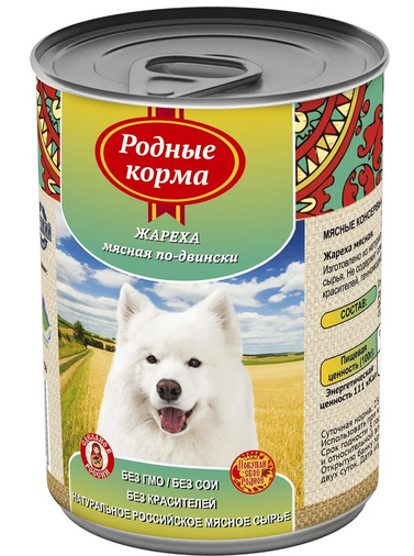 Корм РОДНЫЕ КОРМА Жареха мясная по-двински конс. для собак 970г