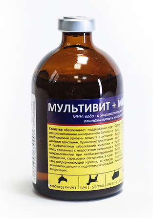 Сбалансированный комплекс важнейших витаминов и минеральных веществ для регуляции и поддержания всех физиологических процессов в организме животных. СОСТАВ: В 1 мл препарата содержится: 50000 МЕ витамина А (ретинола пропионата), 25000 МЕ витамина D3, 4 МЕ витамина Е (альфа-токоферола ацетата), 10 мг витамина B1, 0,04 мг витамина В2, 1 мг витамина B6, 0,01 мг витамина В12, 2 мг декспантенола, 5 мг холина цитрата, 5 мг витамина В5 (никотинамида), 2 мг инозитола, 5 мг метионина, а также магний, кобальт, медь, цинк, марганец. Способ введения препарата - внутримышечно и орально. Препарат применяют для лечения и профилактики заболеваний животных и птиц, связанных с недостатком витаминов и микроэлементов при несбалансированном кормлении, стрессовых состояниях, в качестве поддерживающей терапии и в период реконвалесценции, повышенная чувствительность к инфекционным заболеваниям, профилактики эмбриональной смертности и нарушений развития плода в перинатальный период;в период подготовки к плановой вакцинации.