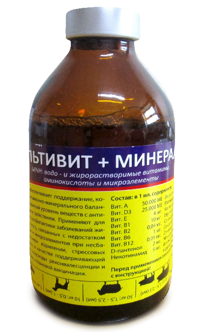Сбалансированный комплекс важнейших витаминов и минеральных веществ для регуляции и поддержания всех физиологических процессов в организме животных. СОСТАВ: В 1 мл препарата содержится: 50000 МЕ витамина А (ретинола пропионата), 25000 МЕ витамина D3, 4 МЕ витамина Е (альфа-токоферола ацетата), 10 мг витамина B1, 0,04 мг витамина В2, 1 мг витамина B6, 0,01 мг витамина В12, 2 мг декспантенола, 5 мг холина цитрата, 5 мг витамина В5 (никотинамида), 2 мг инозитола, 5 мг метионина, а аткже магний, кобальт, медь, цинк, марганец. Способ введения препарата - внутримышечно и орально. Препарат применяют для лечения и профилактики заболеваний животных и птиц, связанных с недостатком витаминов и микроэлементов при несбалансированном кормлении, стрессовых состояниях, в качестве поддерживающей терапии и в период реконвалесценции, повышенная чувствительность к инфекционным заболеваниям, профилактики эмбриональной смертности и нарушений развития плода в перинатальный период;в период подготовки к плановой вакцинации.