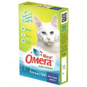 Омега Neo+ — вкусное и полезное лакомство для поощрения, баловства и поддержания естественной красоты шерсти кошек. СОСТАВ: Биотин - придает шерсти кошек блеск и густоту. Новозеландские зеленые мидии - укрепляют хрящевую ткань суставов. Омега-3 кислоты - поддерживают иммунитет и улучшают состояние кожи и шерсти. Пивные дрожжи - натуральный источник витаминов группы В. Способ применения. Рекомендуется 3-5 таблеток ежедневно в течение всего года. Совместимо со всеми ингредиентами кормов и витаминными препаратами без риска передозировки.