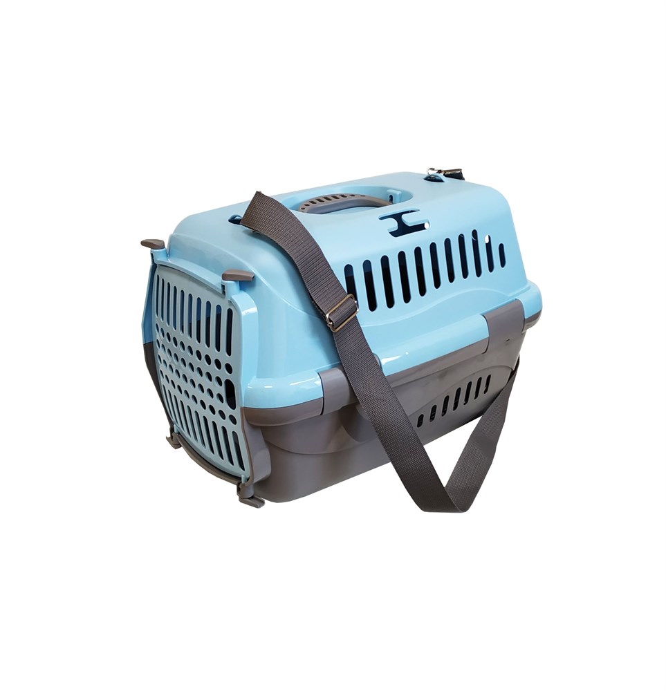 Переноска для животных "Турне" М с прозр. пласт. дверцей (коврик+ремень) 48*32*32 голубая (16121)