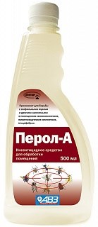 Обработку помещений против насекомых проводят препаратом "Перол-А" в отсутствии животных, продуктов питания и фуража.Одним флаконом можно обработать до 45м2 площади помещения.