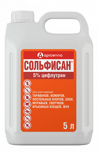 Сольфисан — раствор для уничтожения тараканов, муравьев, клопов, блох, мух, комаров и крысиных клещей на объектах ветеринарного надзора. В качестве действующего вещества содержит Цифлутрин – 5%, вспомогательные вещества до 1 мл.