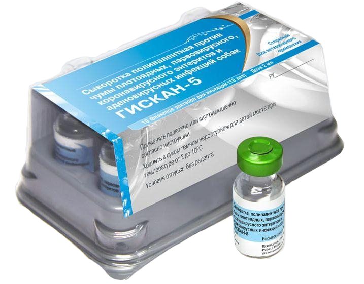 Сыворотка Гискан-5 при введении собакам с профилактической целью обеспечивает пассивный иммунитет против чумы, парвовирусного, коронавирусного энтеритов и аденовирусных инфекций, который сохраняется в течение 2 недель. Сыворотка обладает лечебными свойствами, максимально проявляющимися в инкубационном и продромальном периодах инфекционного процесса.