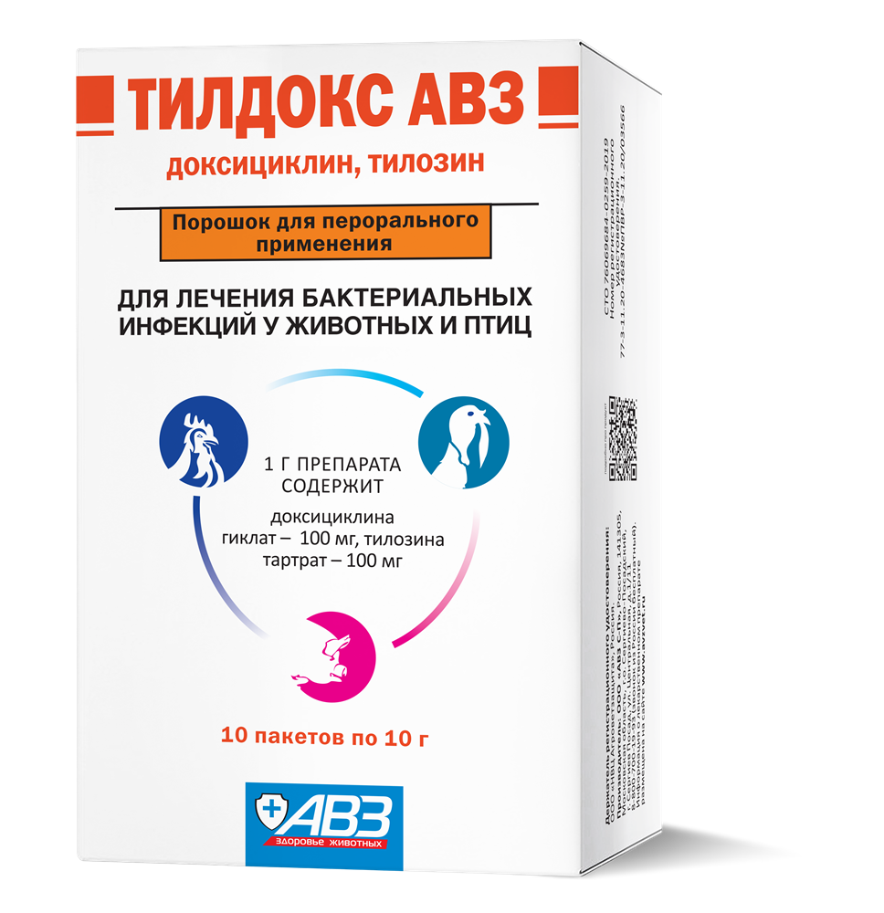 Преимущества: Эффективная комбинация двух действующих веществ; Возможность применения с водой или кормом; Легко дозировать при использовании медикатора; Термостабилен при нагревании в составе кормов. СОСТАВ: в 1 г в качестве действующих веществ доксициклина гиклат – 100 мг, тилозина тартрат – 100 мг. Относится к фармакотерапевтической группе – тетрациклины в комбинации. ПРИМЕНЕНИЕ: назначают с лечебной и лечебно-профилактической целью свиньям и сельскохозяйственным птицам при желудочно-кишечных и респираторных заболеваниях бактериальной этиологии, в том числе пастереллезе, микоплазмозе, колибактериозе, бордетеллиозе, сальмонеллезе, дизентерии, энзоотической пневмонии и других инфекциях, возбудители которых чувствительны к доксициклину и тилозину.
