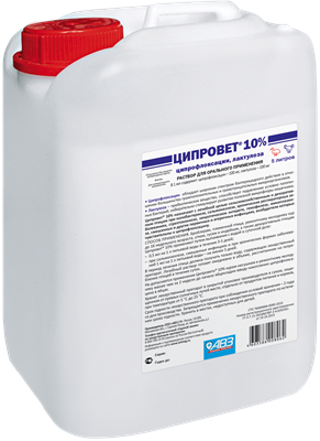 СОСТАВ: ципрофлоксацин - 100 мг/мл, и лактулозу, как вспомогательное вещество.Ципрофлоксацин - антибиотик группы фторхинолонов, обладает широким спектром антибактериального действия, активен в отношении грамположительных и грамотрицательных бактерий, в том числе Echerichia coli, Salmonella spp., Shigella spp., Klebsiella spp., Pseudomonas aeruginosa, Pasteurella multocida и др. Лактулоза - пребиотик, является дисахаридом.Применяется бройлерам, племенной птице, ремонтному молодняку кур до 16 недельного возраста, уткам, гусям и индейкам и декоративным птицам при колибактериозе, сальмонеллезе, хронических респираторных заболеваниях, стрептококкозе, некротическом энтерите, гемофилезе, микоплазмозе, смешанных инфекциях и вторичных инфекциях при вирусных болезнях, возбудители которых чувствительны к ципрофлоксацину.