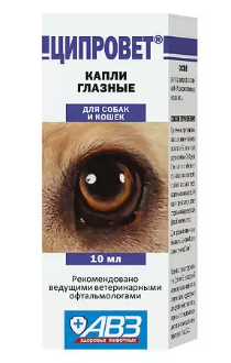 Применяют с лечебной целью при острых и хронических конъюнктивитах, кератоконъюнктивитах, кератитах, язвах роговицы, септических иридоциклитах, блефаритах. В целях профилактики инфекционных заболеваний глаз после травм и попадания инородных тел, а также в глазной хирургии в предоперационный и после-операционный периоды.СОСТАВ: ципрофлоксацина гидрохлорид – 0,45%.ПРИМЕНЕНИЕ:Ципровет капли глазные закапывают в конъюнктивальную полость пораженного глаза кошкам по 1 капле, собакам по 1–2 капли четыре раза в день в течение 7–14 суток до клинического выздоровления животного. При наличии обильного гнойного или слизисто-гнойного отделяемого закапывают 3–4 капли препарата, затем марлевым тампоном тщательно удаляют все отделяемое и корочки. После этого закапывают 1–2 капли лекарственного препарата и проводят лечение.