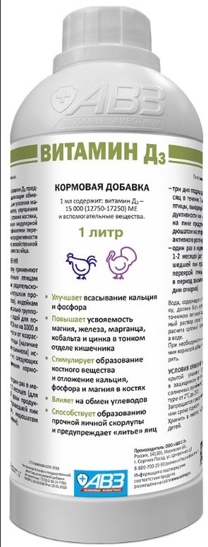 Преимущества.Улучшает всасывание кальция и фосфора. Повышает усвояемость магния, железа, марганца, кобальта и цинка в тонком отделе кишечника. Стимулирует образование костного вещества и отложение кальция, фосфора и магния в костях. Влияет на обмен углеводов. Способствует образованию прочной яичной скорлупы и предупреждает «литье» яиц. СОСТАВ: Витамин Д3 в 1 мл содержит в качестве действующего вещества: Витамин Д3 15000 (12750-17250) МЕ, а так же вспомогательные вещества. Кормовая добавка предназначена для повышения усвоения макро- и микроэлементов , улучшения минерализации и состояния костяка, поддержания функции медулярной кости несушек, профилактики переломов, повышения продуктивности и сохранности сельскохозяйственной птицы, улучшения качества яйца.