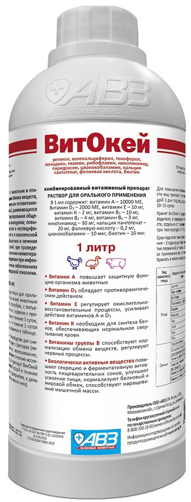СОСТАВ: в 1 мл в качестве действующих веществ содержит витамин А – 10 000 МЕ, витамин D3–2 000 МЕ, витамин Е – 10 мг, витамин К – 2 мг, витамин В1 – 10 мг, витамин В2 – 4 мг, витамин В6–3 мг, никотинамид – 30 мг, кальция пантотенат – 20 мг, фолиевую кислоту – 0,2 мг, цианокобаламин – 10 мкг, биотин – 10 мкг. ПРИМЕНЕНИЕ: применяют животным и птице для нормализации обмена веществ, профилактики и лечения гиповитаминозов и заболеваний, развивающихся на их фоне; для стимулирования общего роста и развития молодняка; повышения продуктивности и неспецифической резистентности; в комплексной терапии для профилактики и лечения стрессов и отравлений; при проведении вакцинации и лечении химиотерапевтическими препаратами при инфекционных, инвазионных заболеваниях и заболеваниях незаразной этиологии.